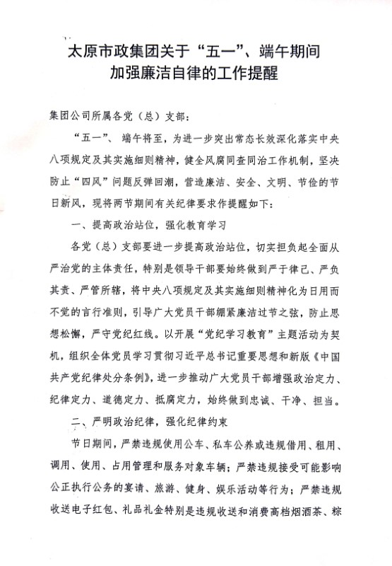 太原市政集團(tuán)關(guān)于“五一”、端午期間加強(qiáng)廉潔自律的工作提醒