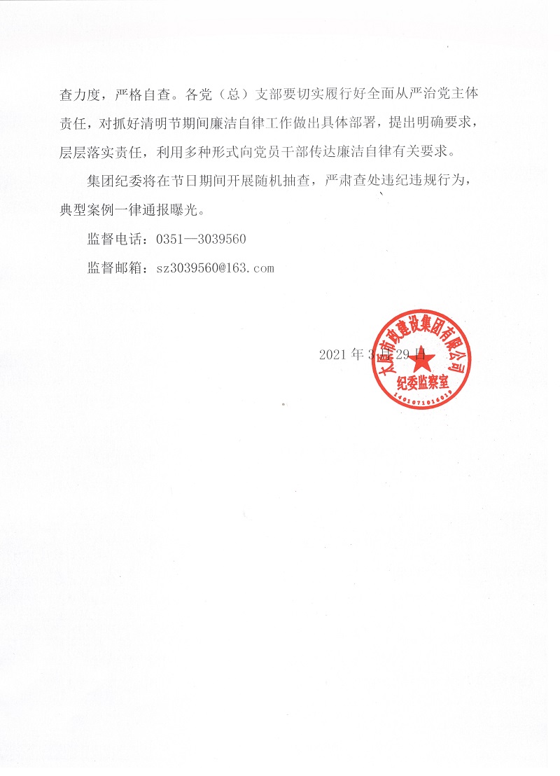 太原市政建設(shè)集團(tuán)有限公司關(guān)于清明節(jié)期間加強(qiáng)廉潔自律工作的通知