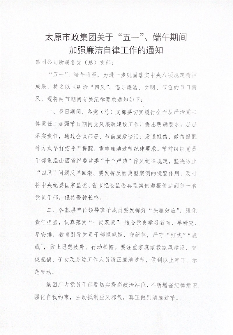 太原市政集團關(guān)于“五一”、端午期間加強廉潔自律工作的通知