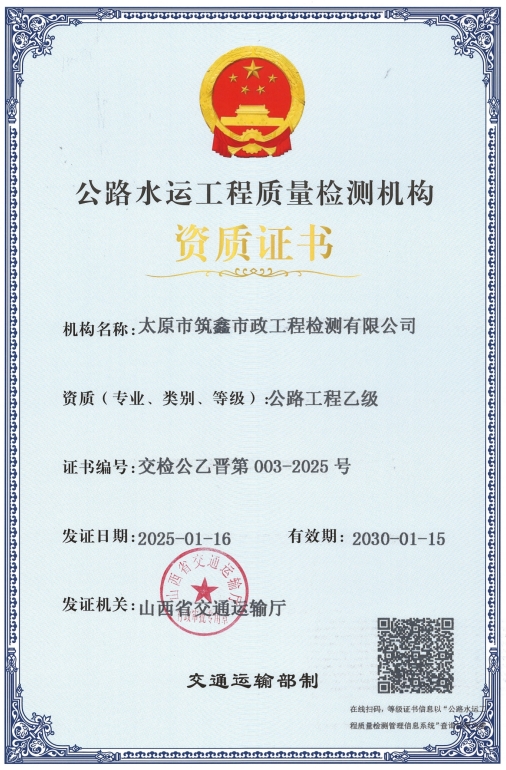 近日,筑鑫公司成功獲得公路水運(yùn)工程質(zhì)量檢測機(jī)構(gòu)“公路工程乙級”資質(zhì)證書。此次資質(zhì)升級,不僅是對筑鑫公司在公路工程檢測領(lǐng)域?qū)I(yè)實(shí)力的有力證明,更是其實(shí)現(xiàn)跨領(lǐng)域發(fā)展的重要里程碑,意味著下一步能夠?yàn)楣饭こ探ㄔO(shè)提供更多維度、更具專業(yè)性與精準(zhǔn)度的檢測服務(wù)。
