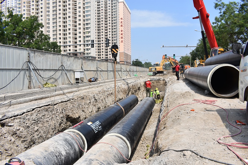 改造期間,項目部施工技術人員根據道路兩側預期規(guī)劃,提前制定了擴改方案,使用設計管徑為DN1000的供熱管道,為轄區(qū)內的小區(qū)預留出供熱余量。由于該工程位于老城區(qū),地下管線尤為復雜,加之前期現(xiàn)狀管線資料不全,施工開始前,太原城市建設有限公司第五項目部的技術人員就提前做好溝槽的定位工作,采取整體放線、統(tǒng)一開挖的辦法,通過計算,提前讓熱力管道逐漸改變坡度,有效避開污水管道、燃氣管道等障礙物。同時,由于管道沿線區(qū)域地下水位高,施工人員根據現(xiàn)場實際情況,安裝了15個100毫米口徑的電動多級離心泵進行明排水施工,保證了施工進度。
